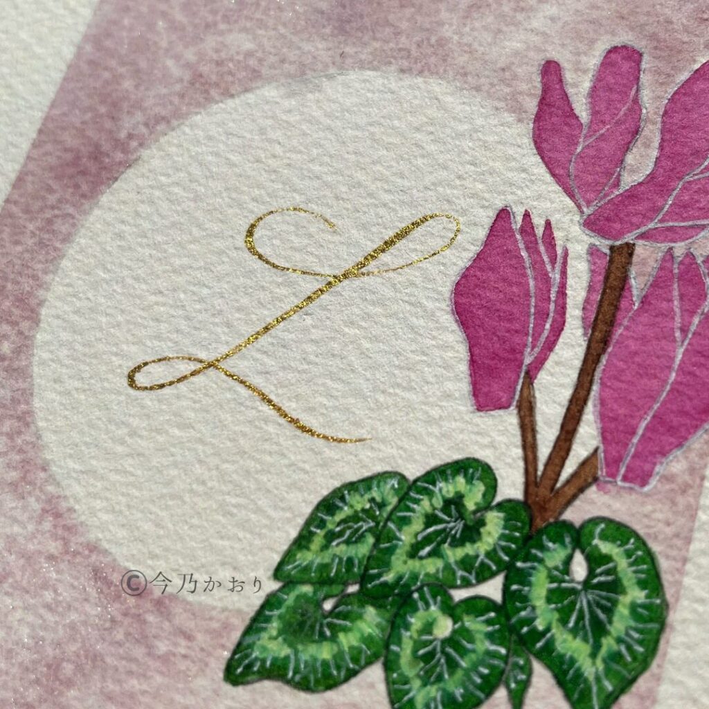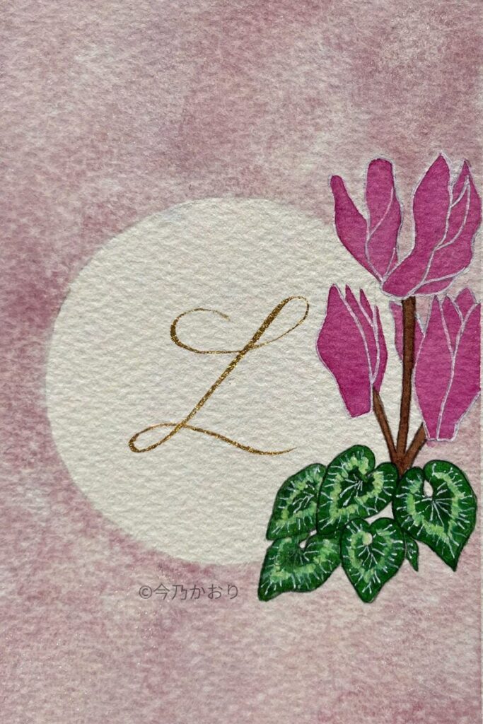 シクラメンの花言葉「遠慮」「はにかみ」をテーマに、カッパープレート体のLで繊細に表現。凜とした美しさと優しさをイメージした作品です。