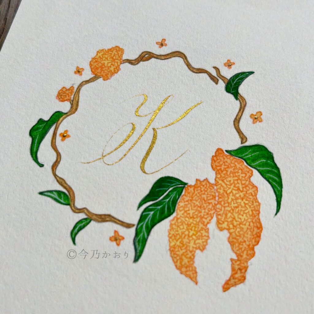 秋の香りを代表する花「金木犀」と、オリジナルアレンジしたカリグラフィーのkを組み合わせました。