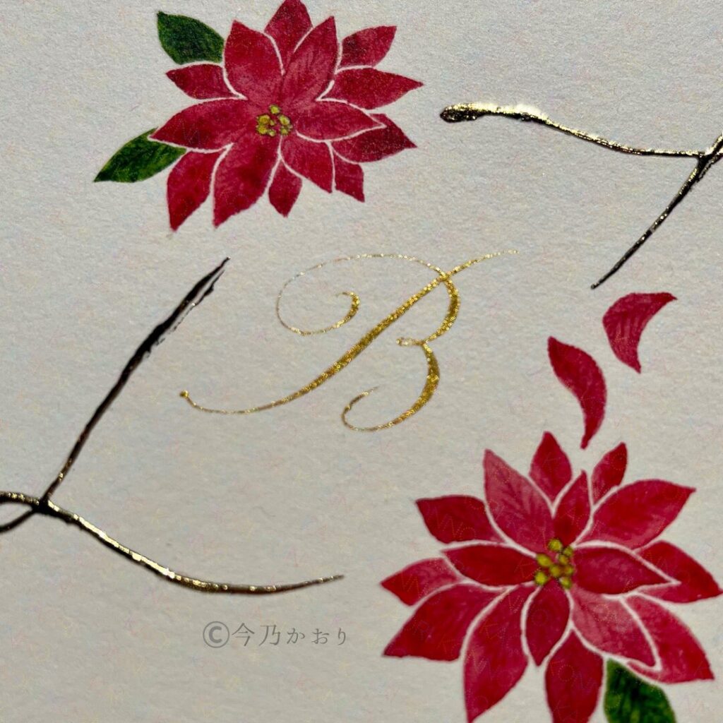 ポインセチアの花びらは、水彩の重ね塗りでグラデーションを出し、重厚感のあるこっくりとした深紅を表現しました。