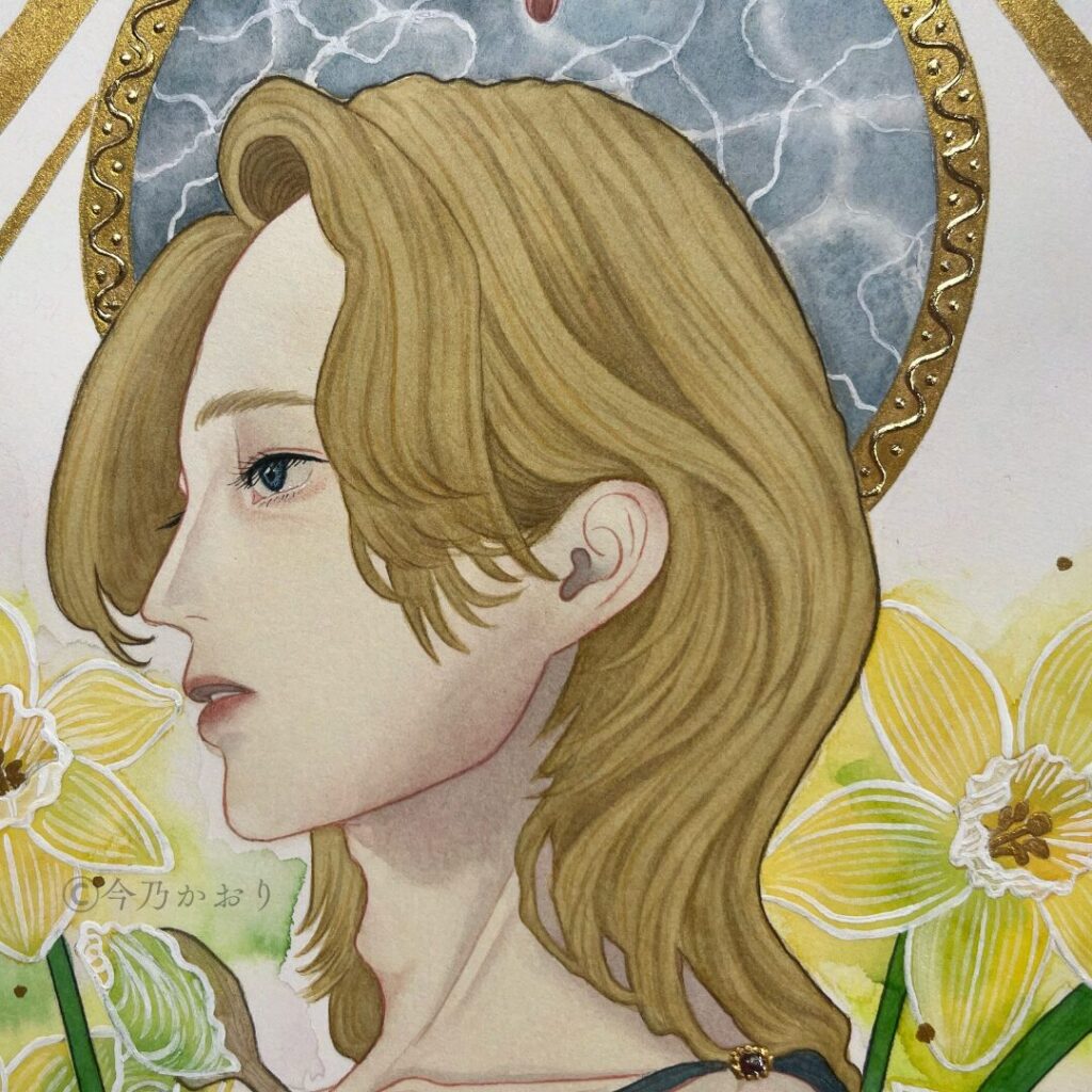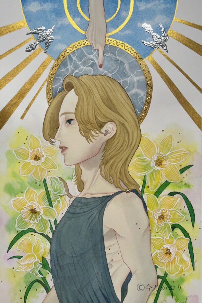 ギリシャ神話のナルキッソスをモチーフにしながら、今回は私自身の感性を通して、新しい一枚として形にしてみました。